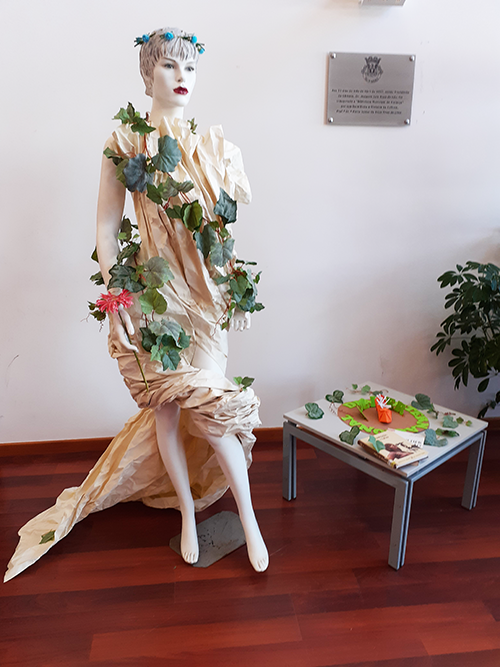 Trabalho em papel de cenário decorado com ramos de videira, executado por Vera Cavaca e Paula Quinta.