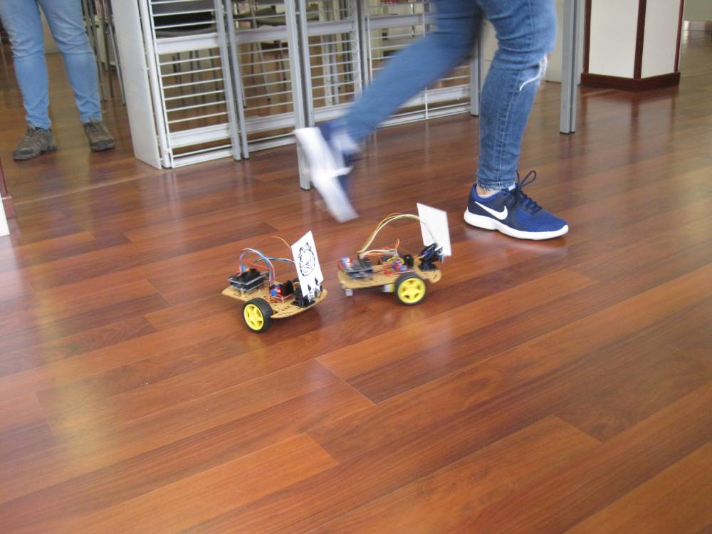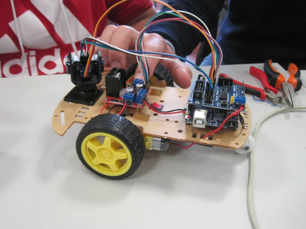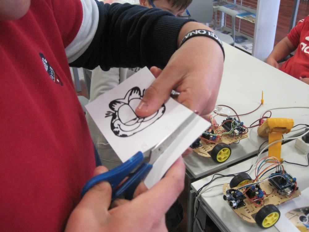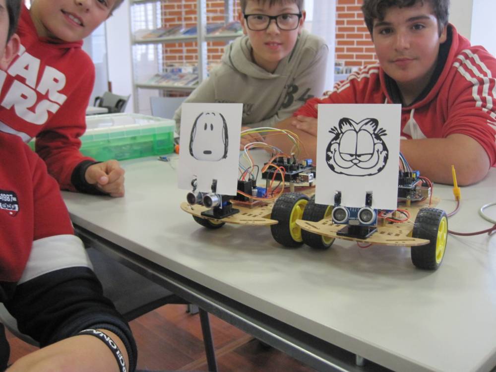Após a contextualização sobre a electrónica e da robótica, como é que as coisas funcionam, foi com entusiasmo que se procedeu à montagem do robô. Num trabalho em equipa, desde o aperto do 1º parafuso, revelando grande destreza, a obra mecânica foi ganhando forma. De seguida, montou-se a eletrónica (Arduino, etc.), programou-se, testou-se, fizeram-se os ajustes e...assim nasceu o Gardfield robô da BMA. Para o gato mais famoso da BD demos-lhe como companhia o igualmente famoso Snoopy. E cão e gato fizeram-se ao caminho biblioteca fora, explorando os seus recantos. Será que encontraram alguns dos seus livros?? Afinal esses já lá estão há 30 anos!